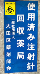 使用済み注射針は薬局でも回収しています。大田区薬剤師会所属の薬局では、「使用済み注射針回収薬局」のポスターが目印です。