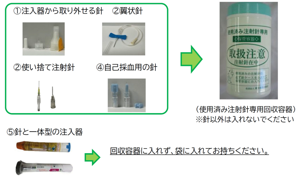 針がむき出しのものは、針が貫通しない容器に入れお持ちください。針が貫通しない容器は、処方箋等により針をお渡しする際に一緒にお渡しすることできます。